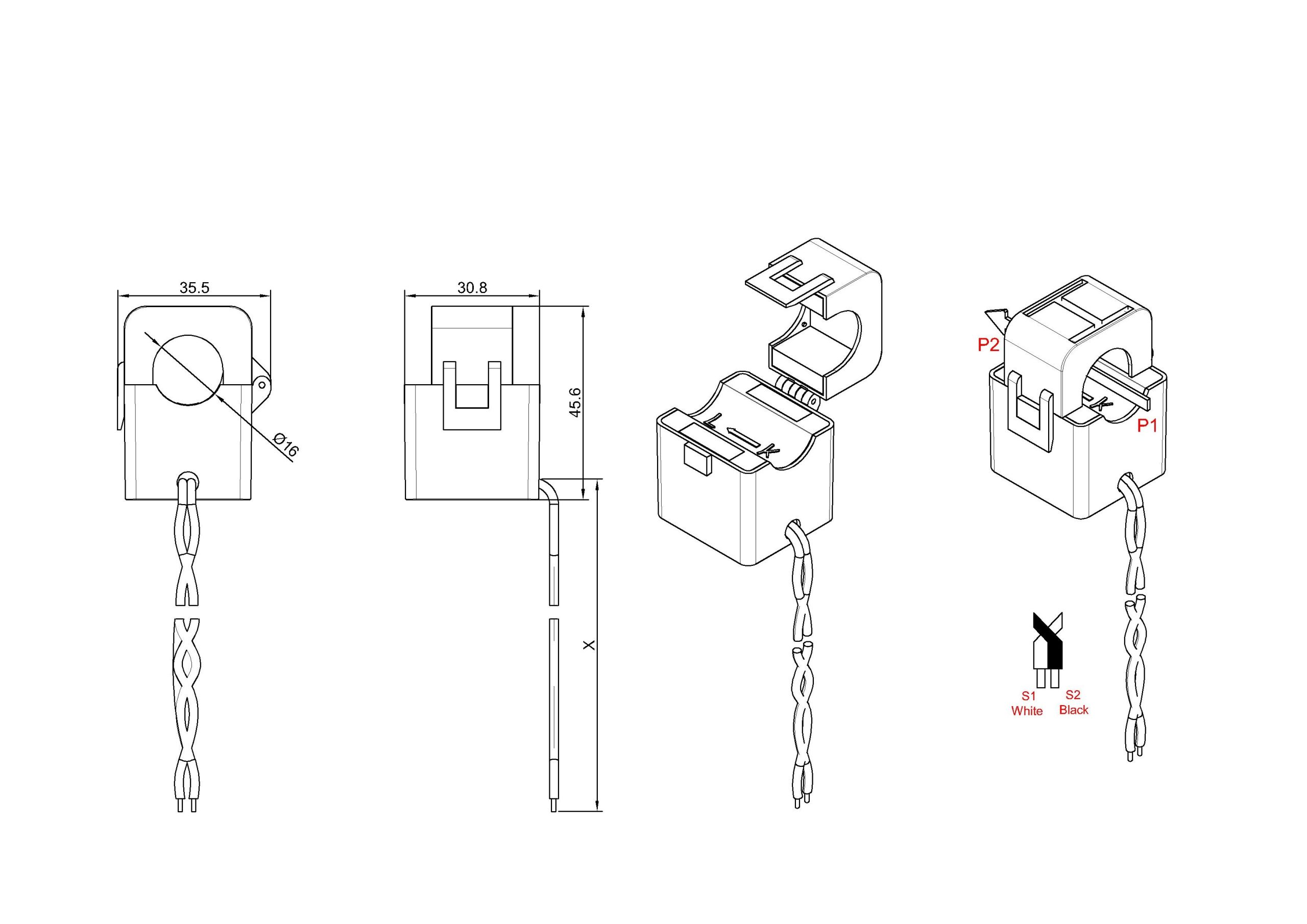 Jiangyin Spark XH-SCT-T16 Series split-core current transformer senses AC current from 0 to 120 Amps passing through the center conductor.Split core CTs are designed for fast and easy installation.The split core design permits non-contact current measurements through magnetic field induction without requiring that the primary wire be taken offline and disconnected for CT installation.This method permits a safer,easy and portable current measurement.